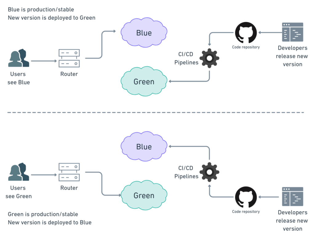 Quando se deparamos com diferentes versões do aplicativo rodando para produção, o Blue-green deployment atua como se fosse um switch toggle de servidores para uma dessas versões prontas para produção.