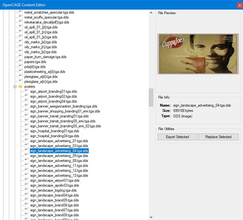 The Alien: Isolation Mod Tools have the functionality to import and export textures from the game. Alien: Isolation uses a proprietary "TEX4" texture format, however most of these can be handled as DDS. The tool allows import/export of DDS textures with a variety of DDS versions supported. Some texture files do fail to convert however, and will cause issues. If you come across a broken texture file, please report it using the GitHub Issues tab. A few failures are known (and expected) such as the SDF text files; since these are not DDS images!