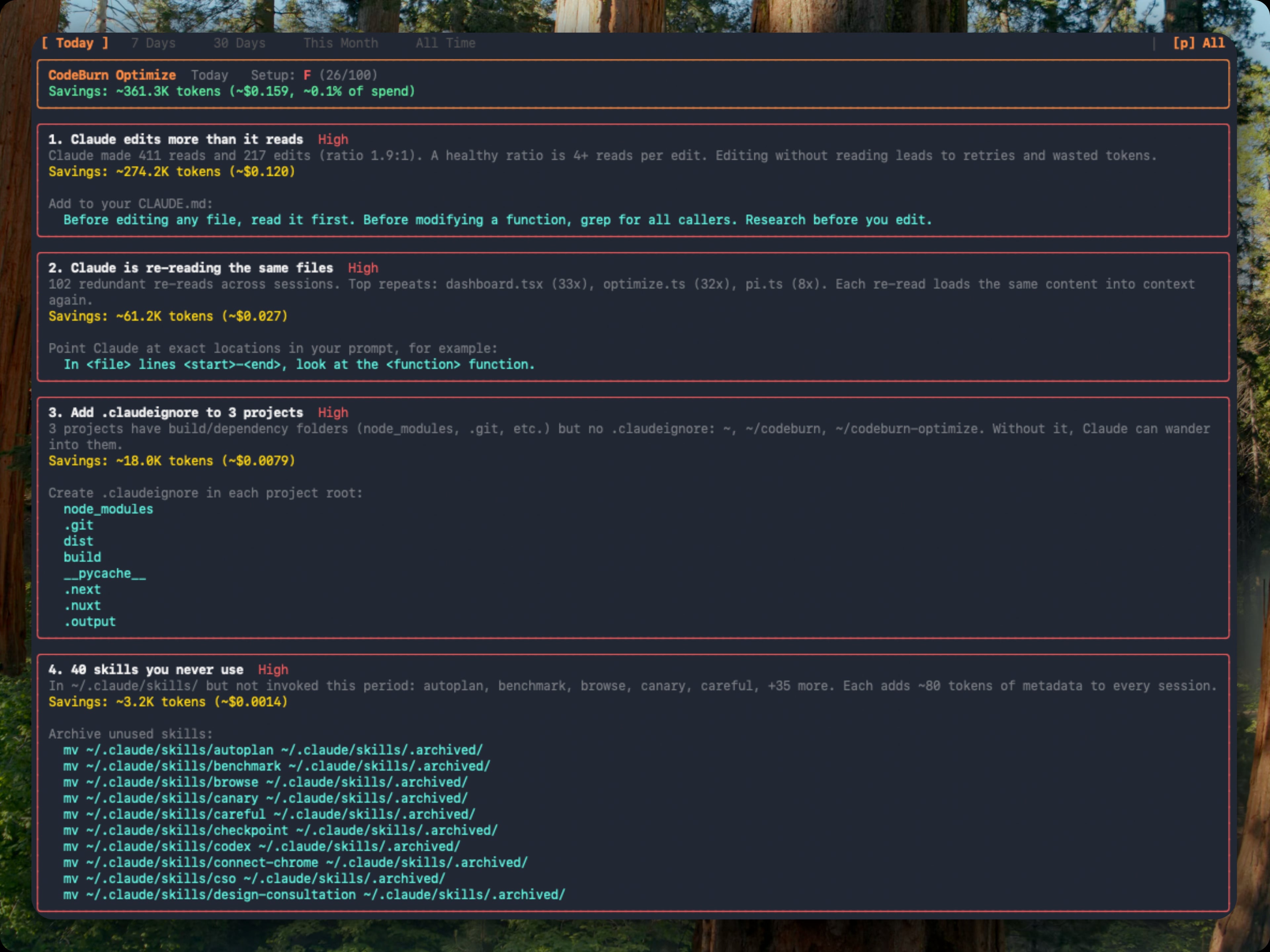 codeburn optimize # scan the last 30 days