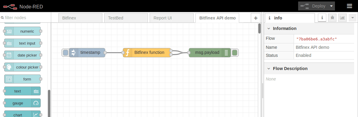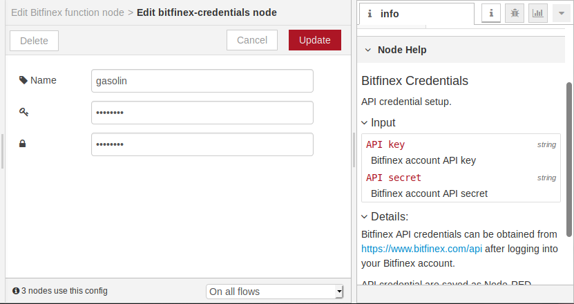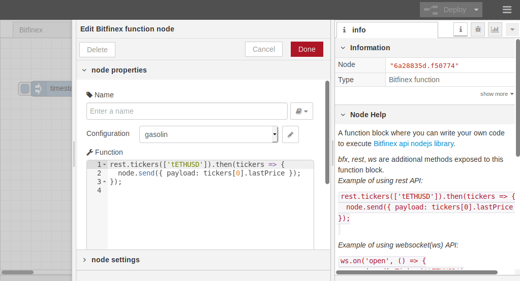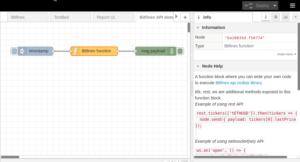 - A Function block where you can write your own code to execute Bitfinex's nodejs API library