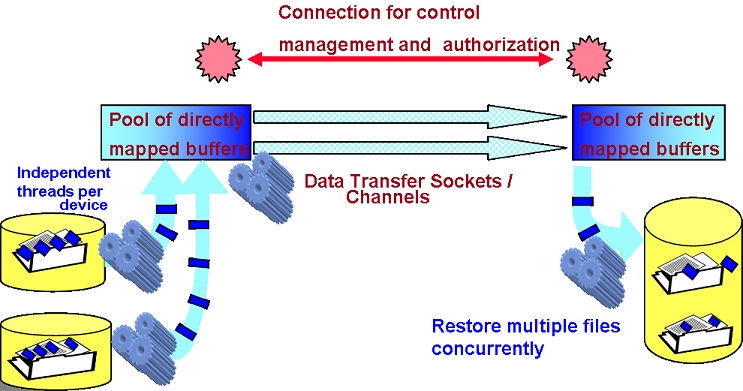 Streams a dataset (list of files) continuously, using a managed pool of buffers through one or more TCP sockets. Uses independent threads to read and write on each physical device Transfers data in parallel on multiple TCP streams, when necessary Uses appropriate-sized buffers for disk I/O and for the network Restores the files from buffers asynchronously Resumes a file transfer session without loss, when needed FDT can be used to stream a large set of files across the network, so that a large dataset composed of thousands of files can be sent or received at full speed, without the network transfer restarting between files.