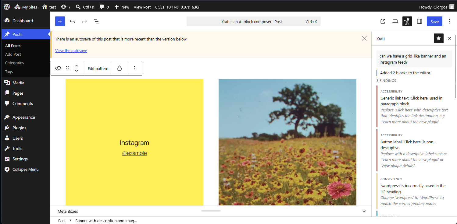An Experimental WordPress AI block composer. Describe the content you want and Kratt inserts the right blocks, without requiring you to know block names or navigate the inserter.